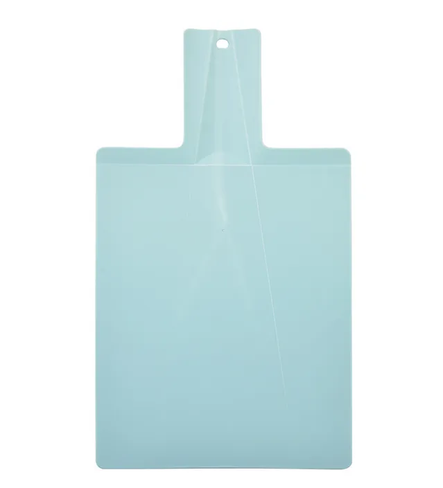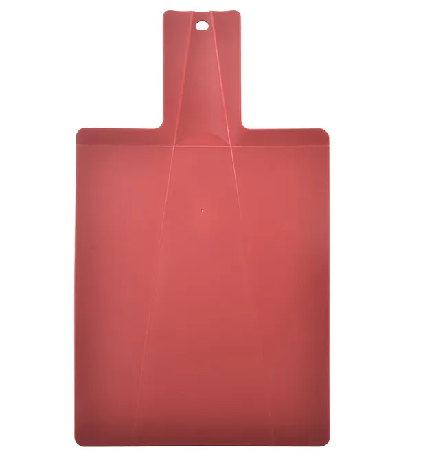 This foldable plastic cutting board is made of PP material, a soft-grip handle, and non-slip feet. Laid flat, it provides a durable, knife-friendly cutting surface for all types of food preparation. But when the handle is squeezed, the sides of the board fold up, forming a convenient chute down which chopped food or waste can be neatly guided.